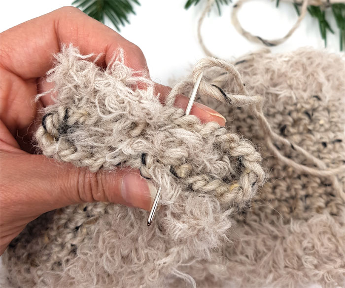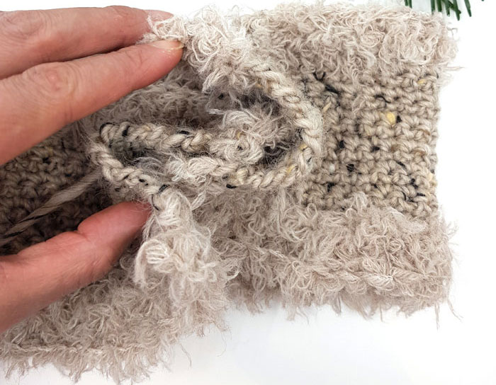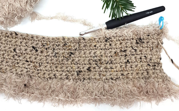 - Rad 12: 1 lm, 1 fm ut raden, til gjennomtrekking ved siste fm. Her skifter du tilbake til garn A, og til krok 7 mm. Snu.