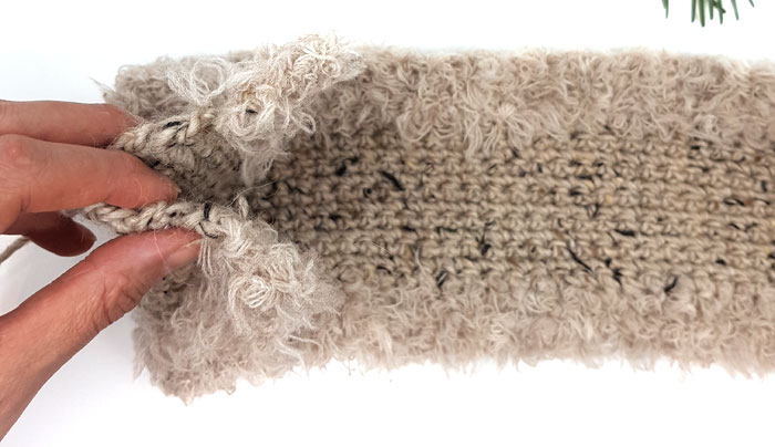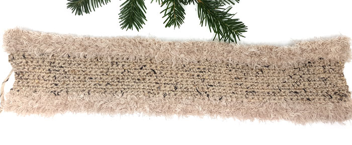 Som du ser så har hun brukt et ganske tykt garn. Alpakka tweed fra Du store alpakka og så har hun kantet med med Pure Eco Fur fra Dalegarn. Du trenger ikke å være redd for at garnet klør for det gjør det ikke. Det er bare så nydelig å ha på. Du kan jo bruke hvilket som helst garn både til selve båndet og kanten rundt. Egner seg godt til å benytte restegarn dette.