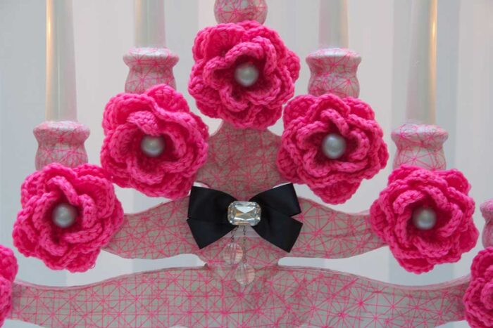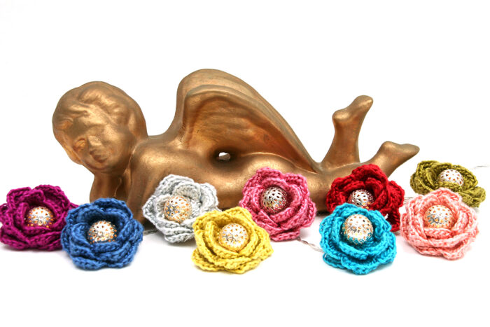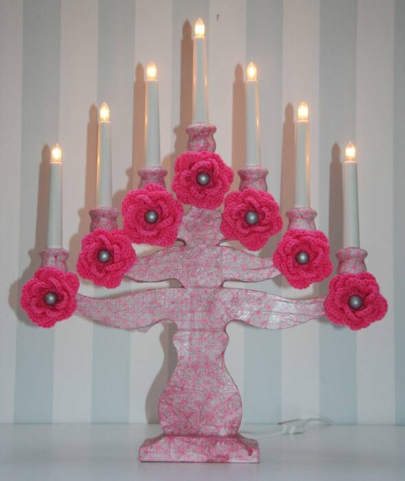 I familien min så har vi heklet over 50 roser som vi bruker til sommerfesten, konfirmasjoner og juleselskaper, til det har vi brukt silkegarn samme som bildet av lyslenken på toppen. Vi har en boks hvor vi samler slike ting og så går den på omgang alt etter hvem som. skal holde lag.